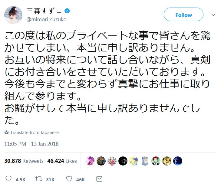 성우 미모리 스즈코씨가 자신의 트위터에서 오카다 카즈치카 선수와의 교제에 대해 언급