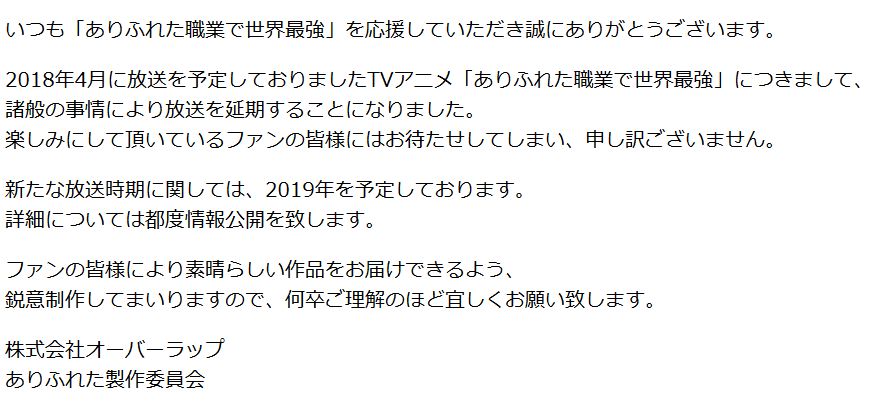 2018년 4월에 방송될 예정이었던 '흔해빠진 직업으로 세계최강' TV 애니