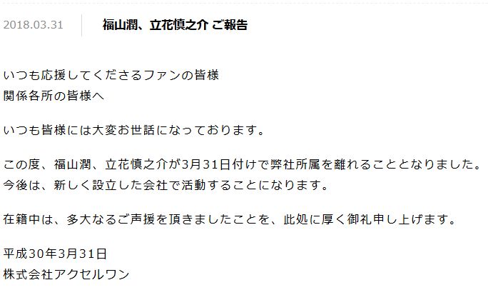 성우 후쿠야마 쥰씨와 타치바나 신노스케씨가 2018년 3월 31일자로 원래 소속