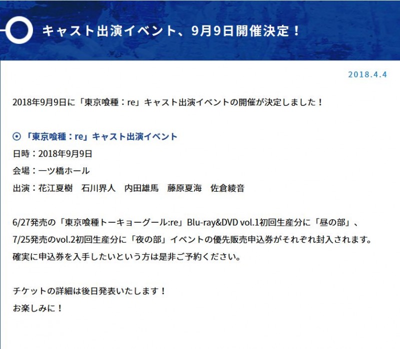 2018년 9월 9일, '도쿄구울: re'의 성우 출연 이벤트 개최가 결정되었다고