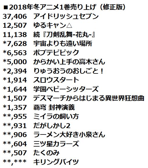 * 2018년 겨울 시즌 애니메이션 블루레이 & DVD 제 1권 판매량 랭킹
