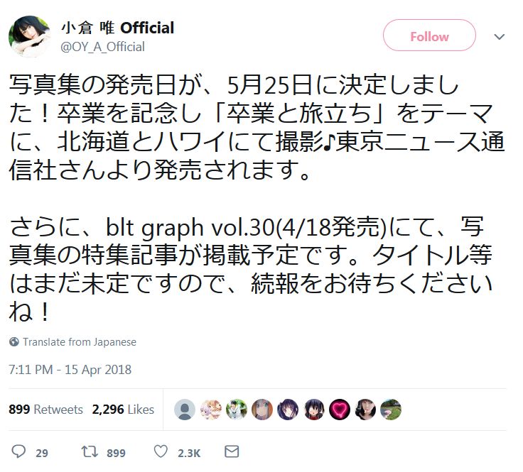 성우 오구라 유이의 사진집이 2018년 5월 25일에 발매될 예정이랍니다.