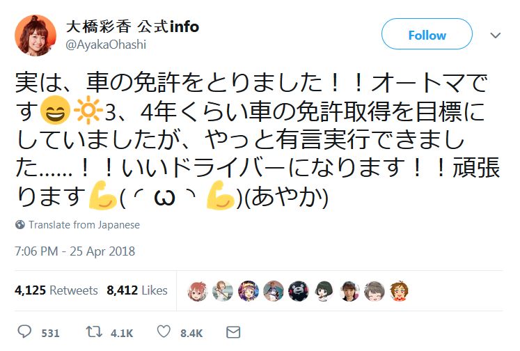 성우 오오하시 아야카가 운전 면허증을 취득한 모양입니다.