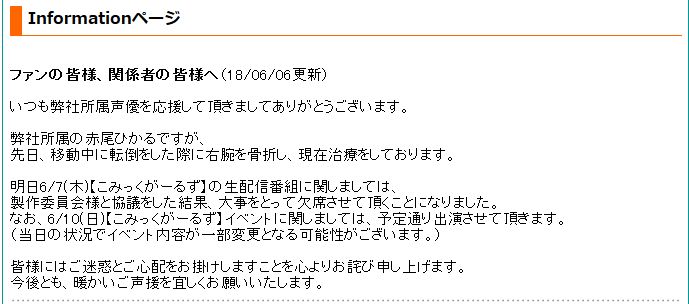성우 아카오 히카루, 이동중에 굴러 넘어져서 오른팔에 골절상을 입고 치료중