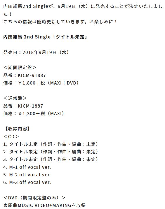 성우 우치다 유마의 2nd 싱글이 2018년 9월 19일에 발매될 예정이라고