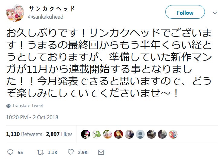 '건어물 여동생! 우마루짱'의 작가인 '산카쿠헤드'씨가 자신의 트위터에
