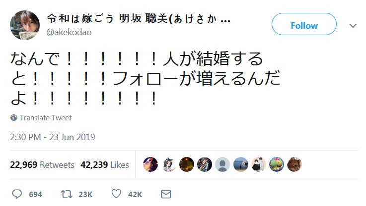 성우의 결혼 소식이 나오면) 자기도 모르게 아케사카 사토미의 트위터