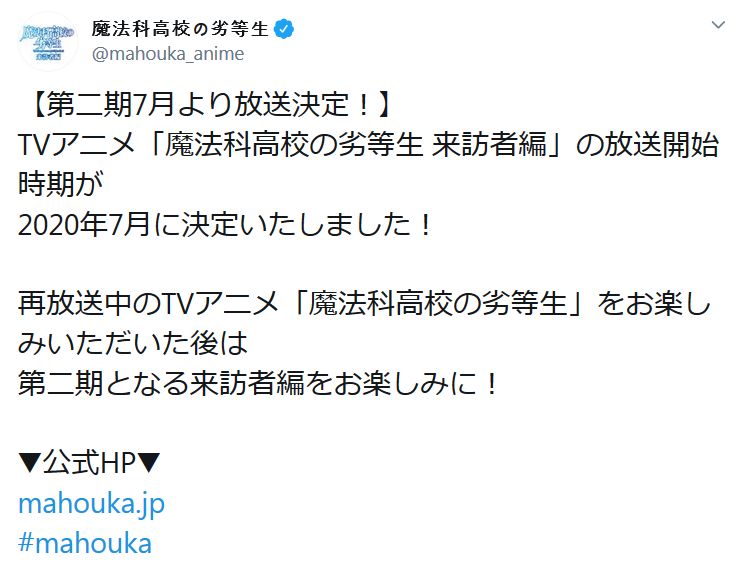 TV 애니메이션 '마법과고교의 열등생 내방자편'의 방송 개시 시기가 2020년 7월로 결정