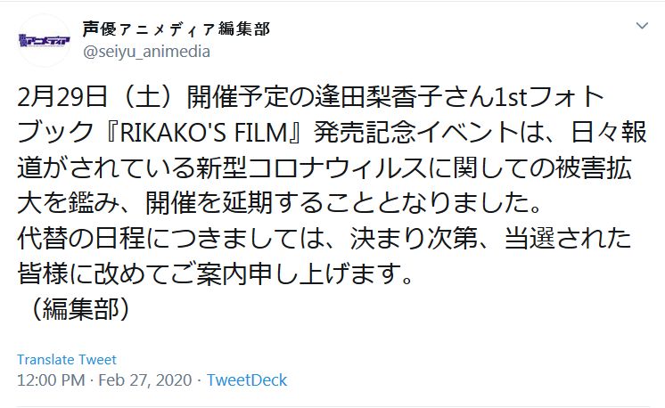 성우 아이다 리카코 1st 포토북 발매 기념 이벤트 연기 발표