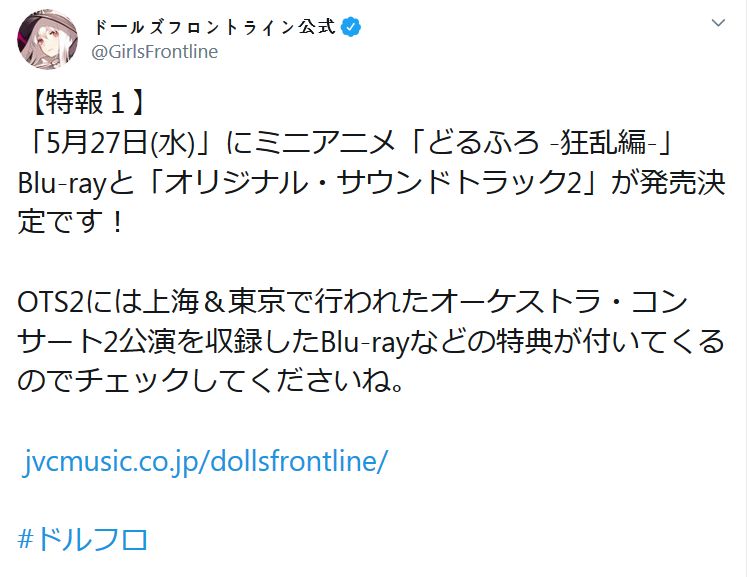 게임 '소녀전선'의 미니 애니메이션 '광란편'의 블루레이가 2020년 5월 27일 발매 예정