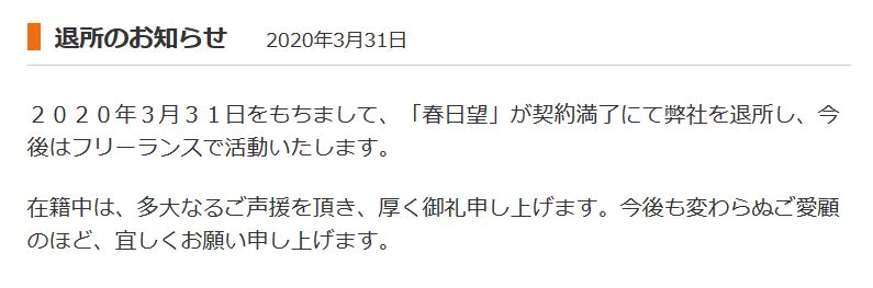 성우 사무소 '클레어 보이스' 측의 공지에 따르면, 성우 카스가 노조미가