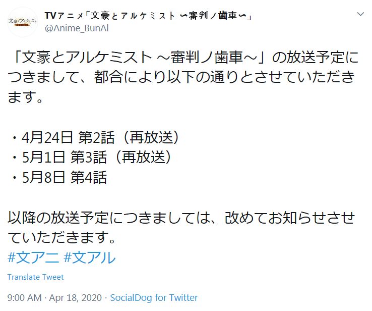 TV 애니메이션 '문호와 알케미스트 - 심판의 톱니바퀴'의 방송 스케쥴 변경