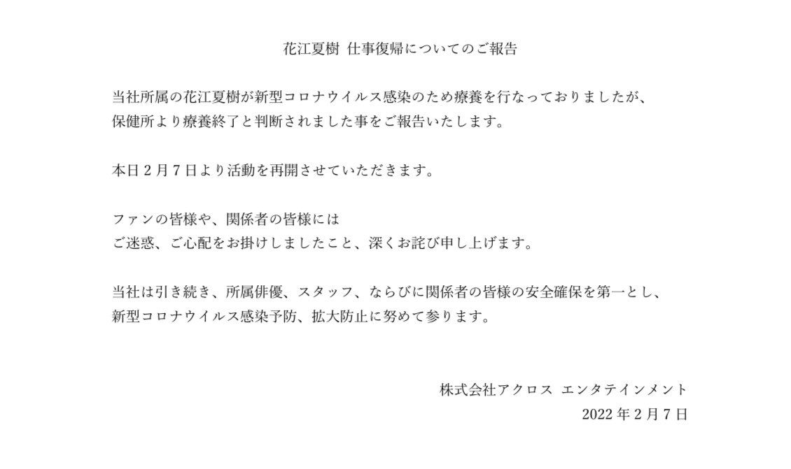 하나에 나츠키는 지난 1월 27일에 코로나 양성 판정을 받고 요양을