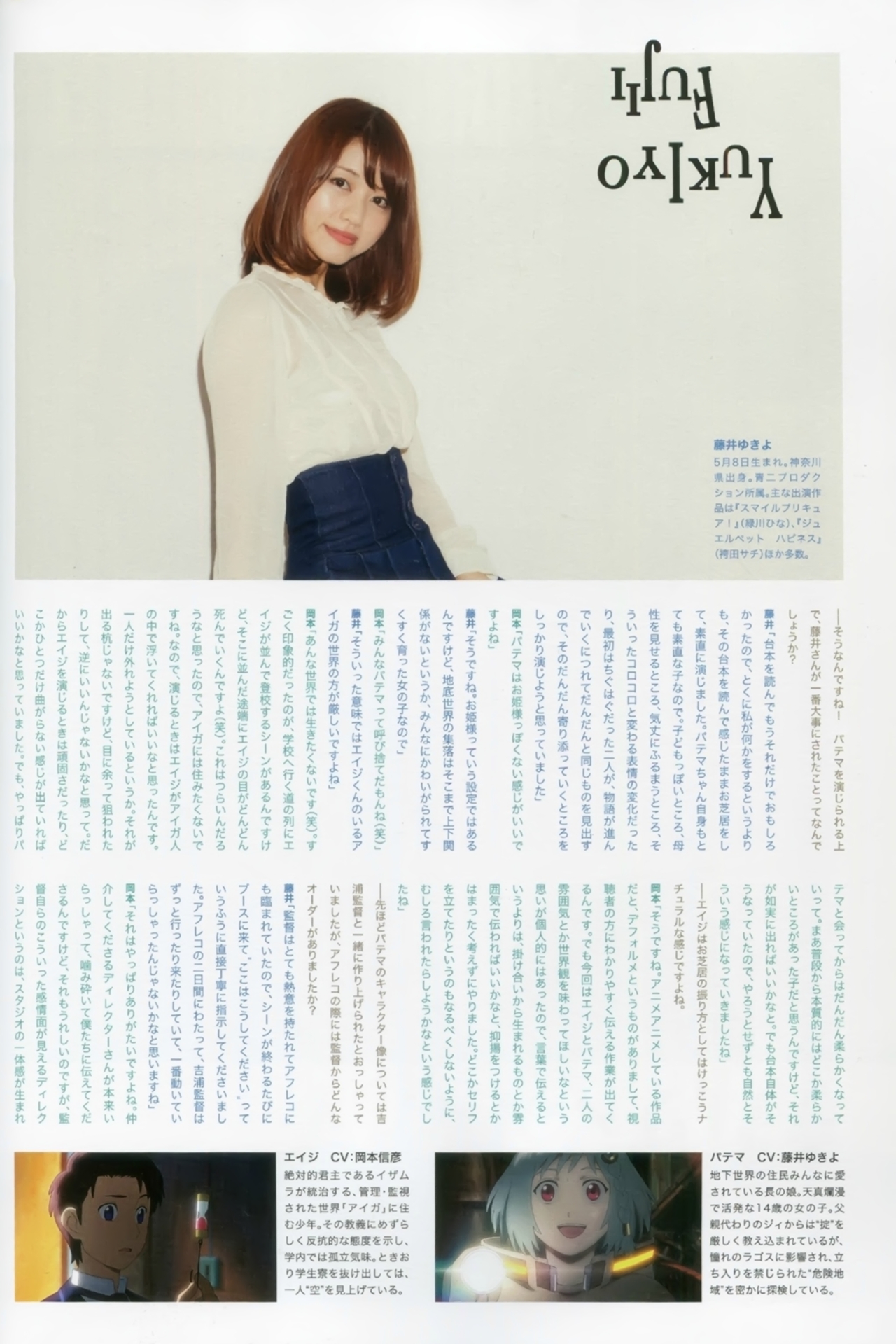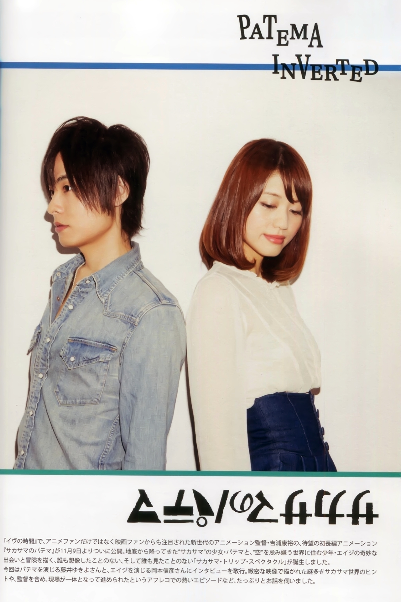 '이브의 시간'으로 유명한 '요시우라 야스히로' 감독의 신작 극장판 애니메이션 '거꾸로 된 파테마'(サカサマのパテマ)가 드디어 내일 11월 9일, 일본 현지에서 개봉할 예정이라고 합니다. 이미 알려진 대로, 요시우라 감독이 원작, 각본, 감독을 모두 담당하는 애니메이션인데요. 남녀 주인공의 성우는 오카모토 노부히코 & 후지이 유키요씨가 맡는다고 하죠. 위쪽사진이 바로 그분들의 사진이 되겠습니다.