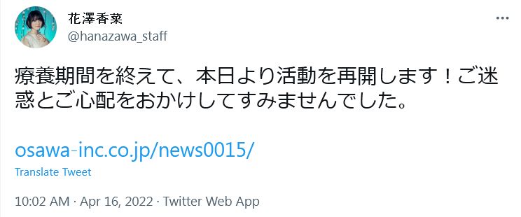 성우 하나자와 카나, 신종 코로나 요양 해제 기준 충족, 2022년 4월 16일부터 활동 재개