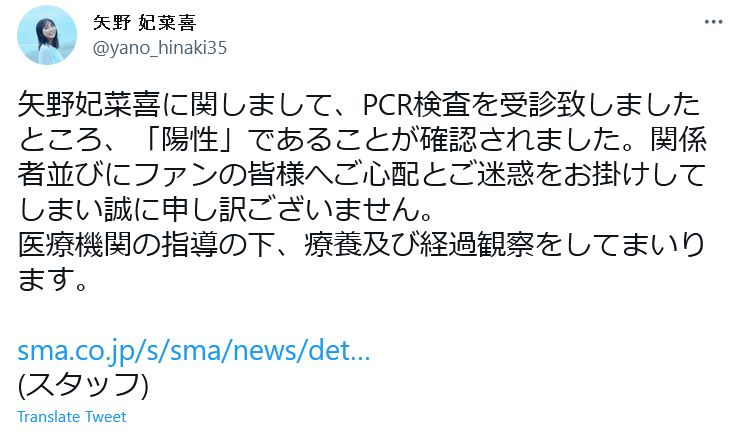 성우 야노 히나키가 신종 코로나 바이러스 양성 판정을 받은 모양