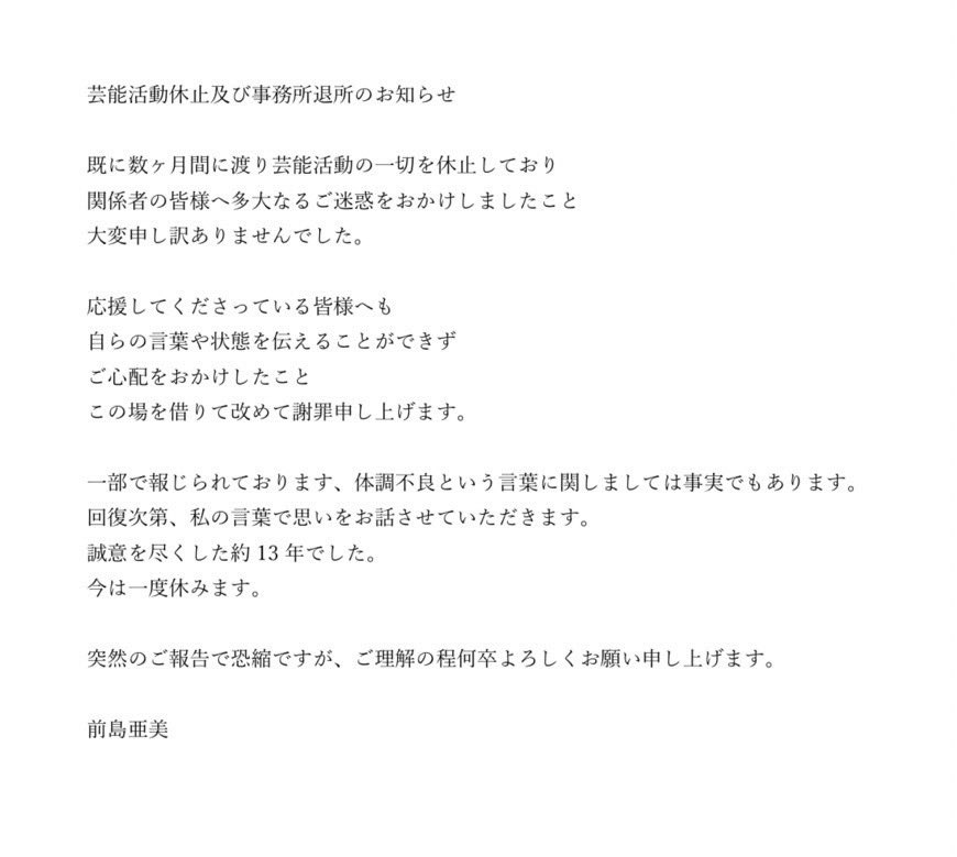 성우 마에시마 아미가 모든 예능 활동을 중지한다고 발표한 모양