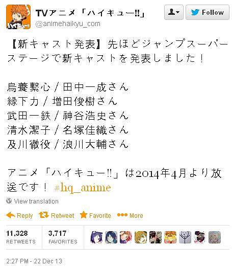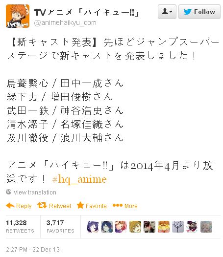 2014년 4월 신작 애니메이션 '하이큐' 추가 성우 캐스팅 몇명 공개