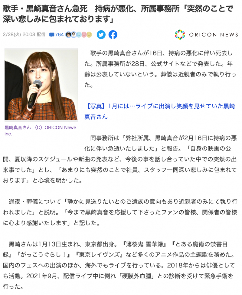 가수 쿠로사키 마온 씨가 16일 지병이 급속도로 악화되어 사망 하셨다고 28일 소속사에서 발표했다고 합니다.