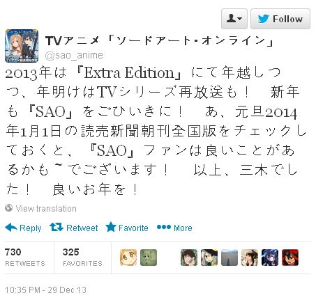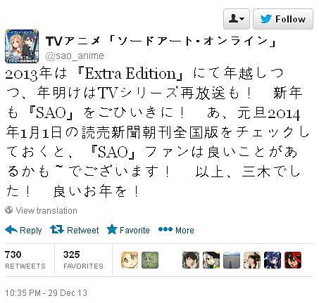 달라는 공지가 나오더니만, 이번에는 '소드 아트 온라인' 애니메이션 공식 트위터에서도 1월