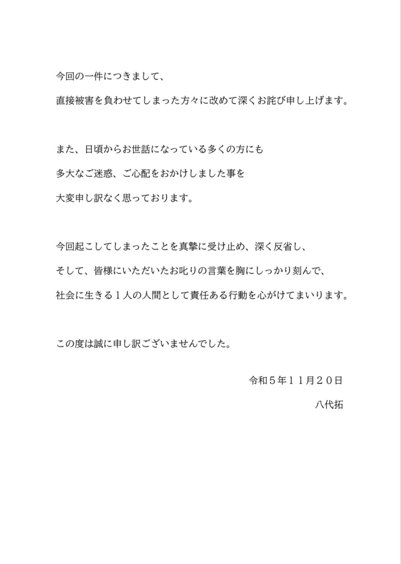 소속사측의 발표에 따르면, 야시로 타쿠 본인의 부주의로 인해