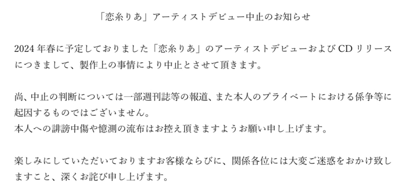 한편, 공식측은 코이토 리아의 공식 X(트위터)에 게재한 공지를 통해,