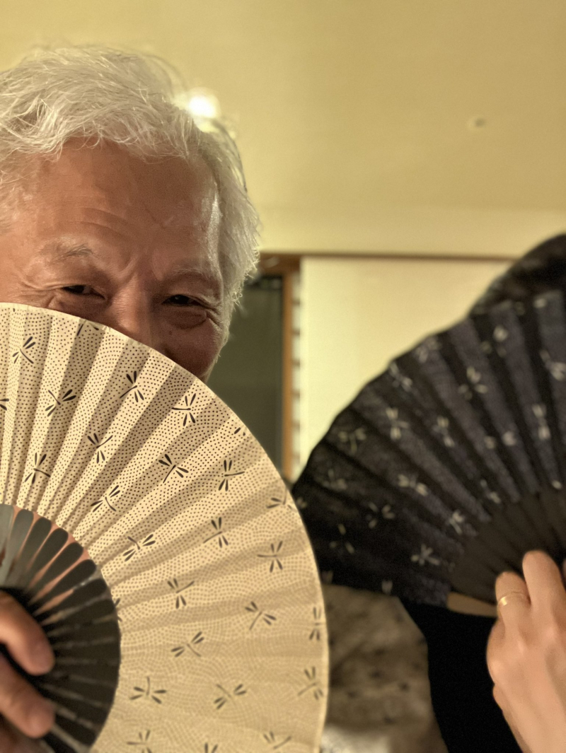 결혼 발표와 더불어, 부채로 얼굴을 가린 배우자와 둘이서 찍은