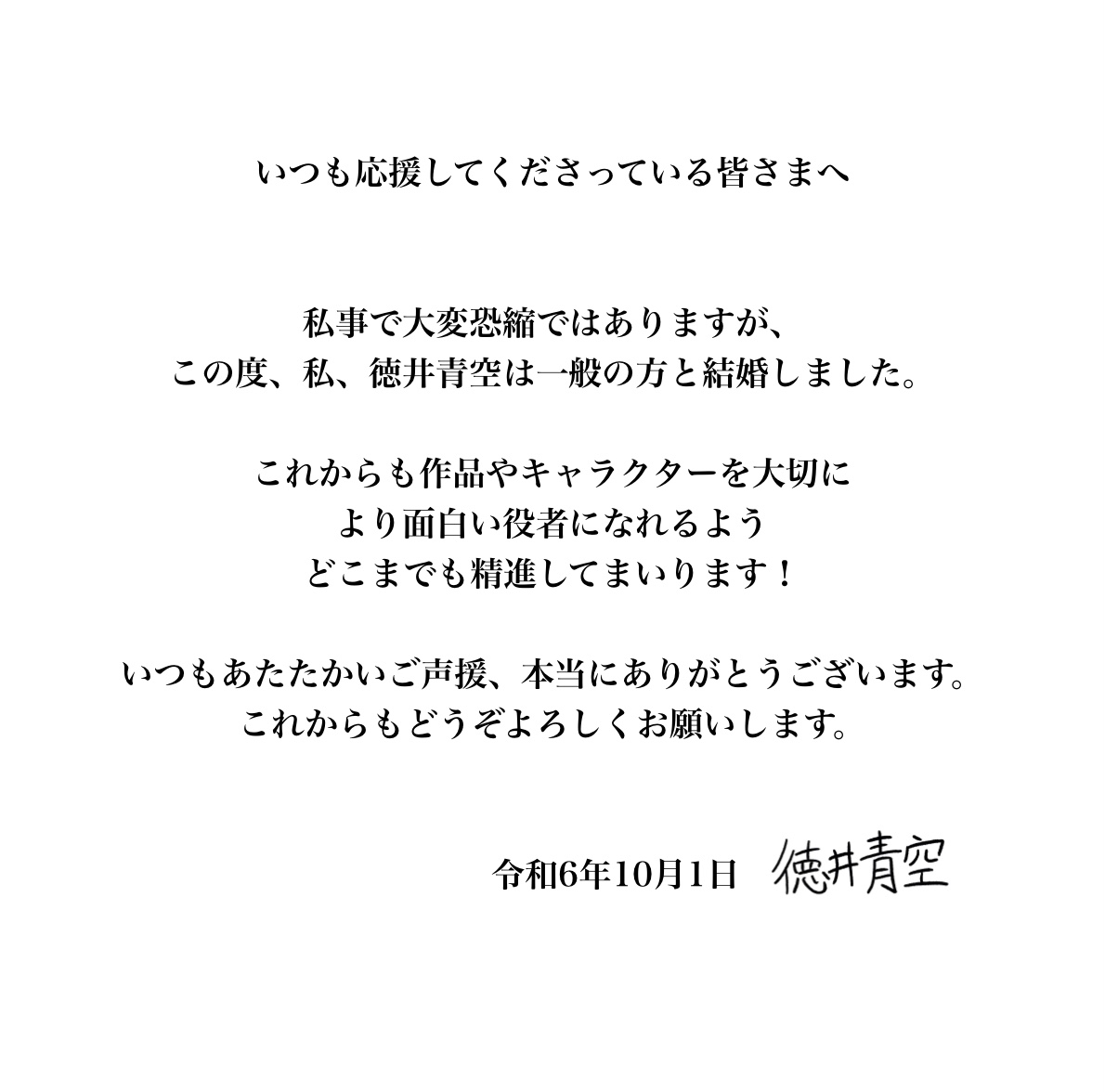 성우 토쿠이 소라, 2024년 10월 1일 자신의 공식 X(트위터)를 통해 결혼 사실 발표