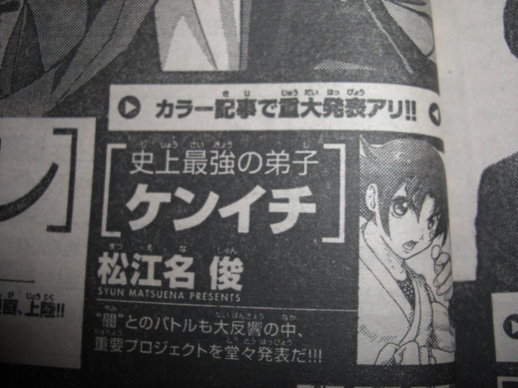 타카후지 카코 만화 '사상 최강의 제자 켄이치' 중대발표 예정! [애니] 작성일시 : 2014. 02. 25 (09:41) 조회 : 4,629 / 댓글 : 1 주간 소년 선데이에 연재중인 만화 '사상 최강의 제자 켄이치'와 관련해서, 어떤 중대발표가 있을 예정이라고 합니다. 그것도 컬러 기사로 중대발표가 실릴 거라는데요. 과연 어떤중대발표가 나올지 기대해 보겠습니다. (역시 애니메이션 관련인 걸까요?) 출처(링크) : http://alonestar.egloos.com/4858111 0추천 글쓰기스크랩 신고
