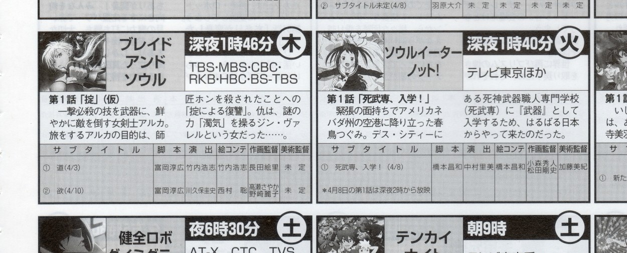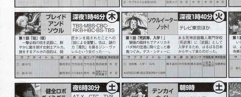 3일 목요일 심야, '소울이터 낫'이 4월 8일 화요일 심야에 방송 개시될 예정이라는 내용을