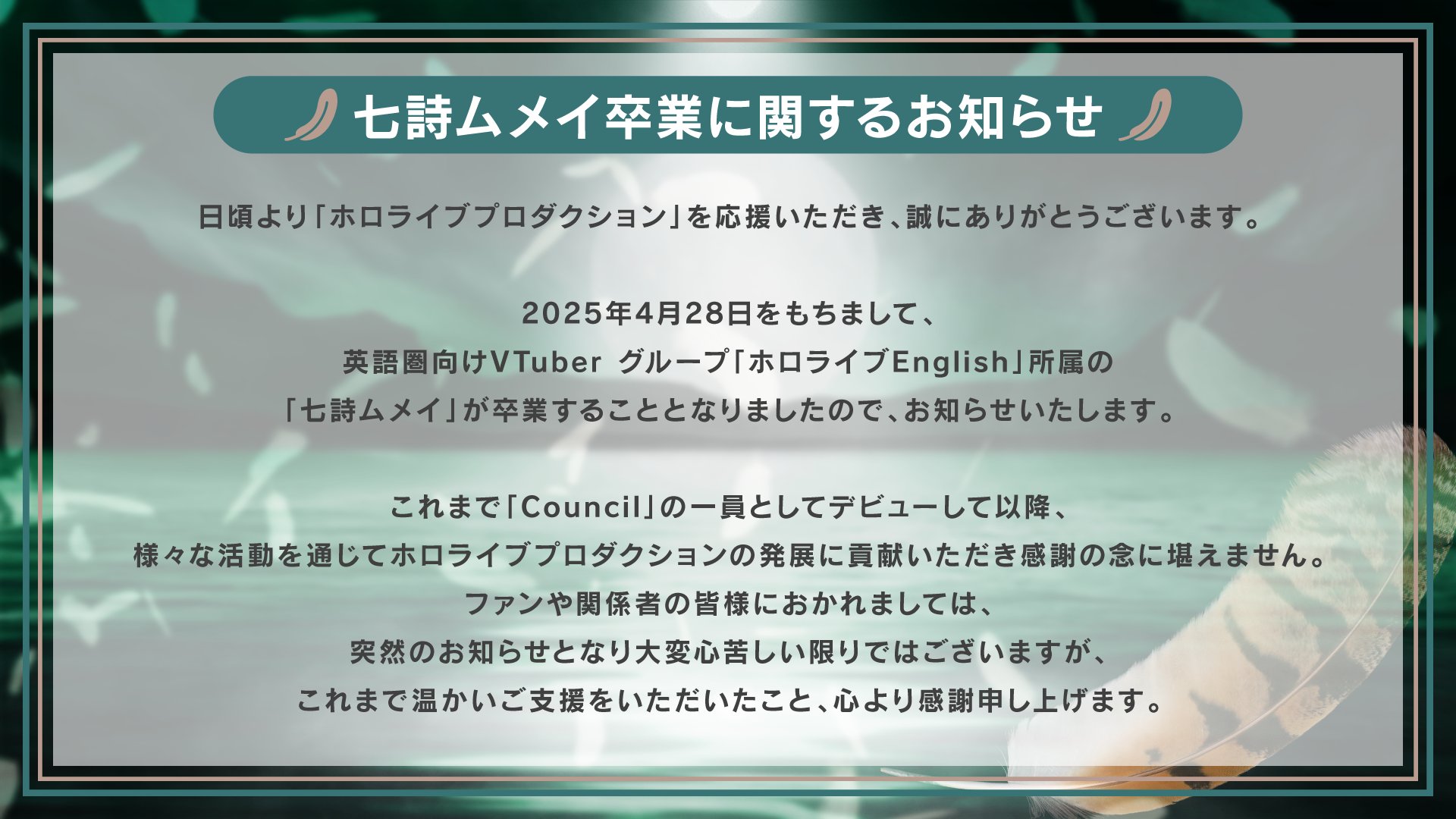 홀로라이브 공식 측에서 졸업 발표가 나왔고, 나나시 무메이