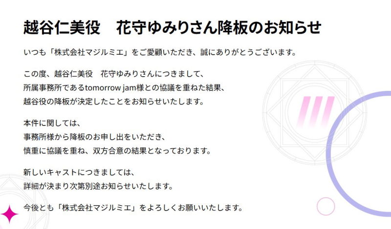 TV 애니메이션 '주식회사 마지루미에' 제 2기 캐릭터 '코시가야 히토미' 역의 성우 하나모리 유미리 하차 발표