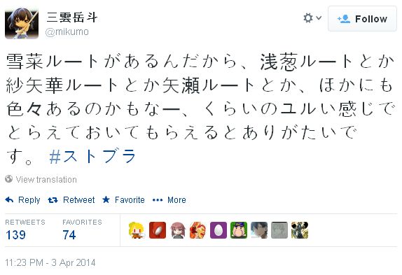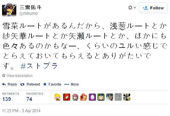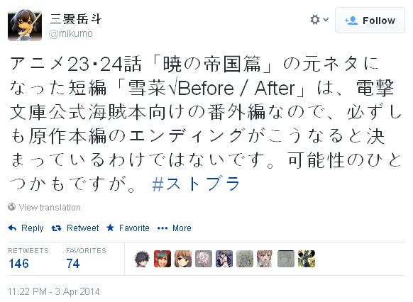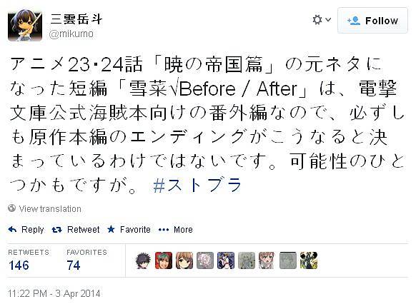 '스트라이크 더 블러드'의 원작자인 '미쿠모 가쿠토' 선생께서 자신의 트위터에 올린 글