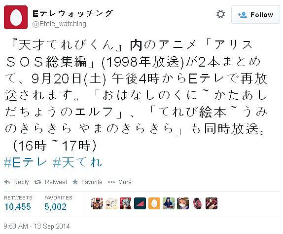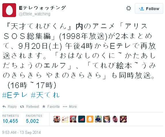1998년에 방송된 '앨리스SOS'라는 애니메이션이 2014년 9월 20일 오후 4시부터 NHK