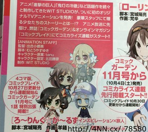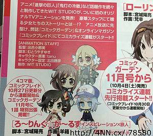 만화 잡지 '월간 코믹 가든' 2014년 10월호에서 발표된 바에 따르면, WIT STUDIO가 준비