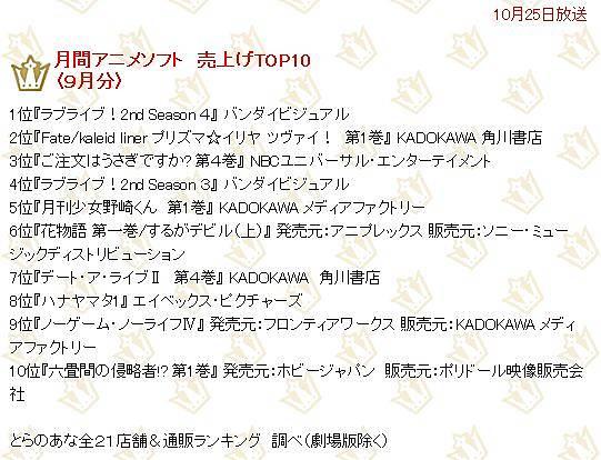 을 조사한 결과를 바탕으로, 2014년 9월분 월간 애니메이션 소프트 매상 랭킹을 발표