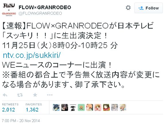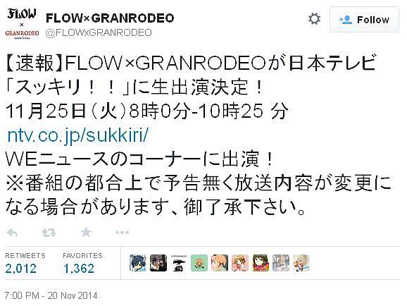 FLOW x GRANRODEO, 닛폰TV의 '슷키리!!'라는 방송 프로그램에 출연 예정