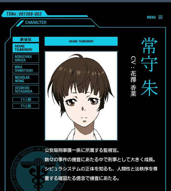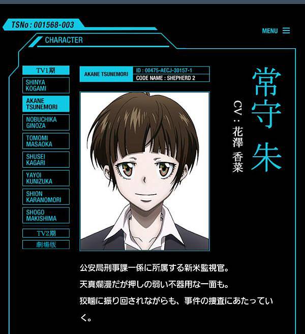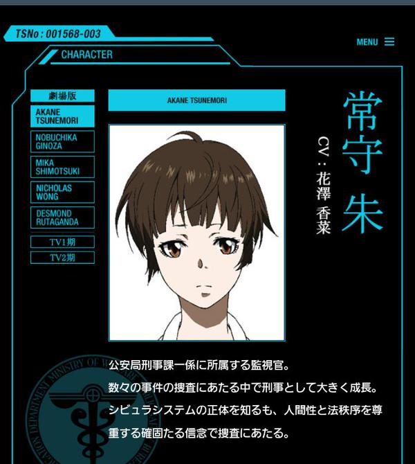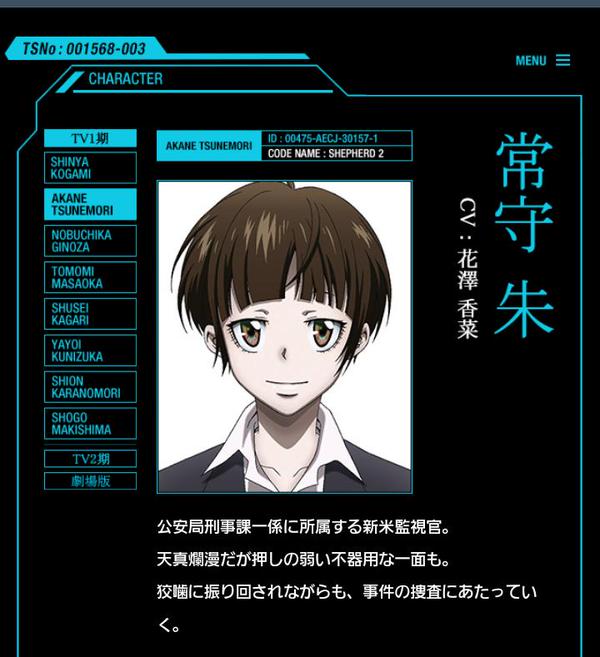 애니메이션 '사이코패스' 홈페이지에 올라와 있는 '츠네모리 아카네'의 캐릭터 소개