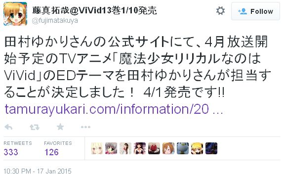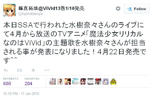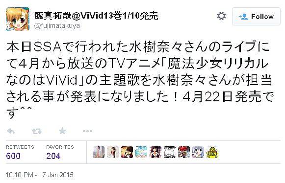 2015년 4월 신작 애니메이션 '마법소녀 리리컬 나노하 ViVid'와 관련해서, 오프닝 테마곡