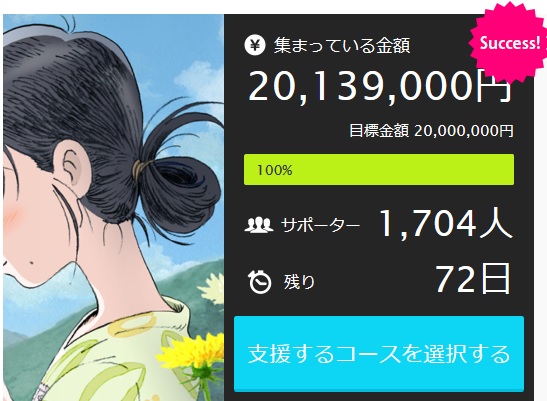 애니메이션 영화 기획 '이 세계의 한쪽 구석에' 제작비 모금, 목표 금액 달성