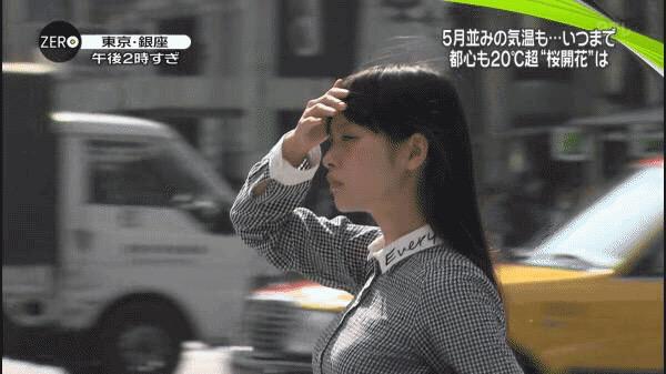 성우 우에사카 스미레가 '봄 답지 않게 더운 날씨'라는 내용의 보도를 하는 TV 뉴스