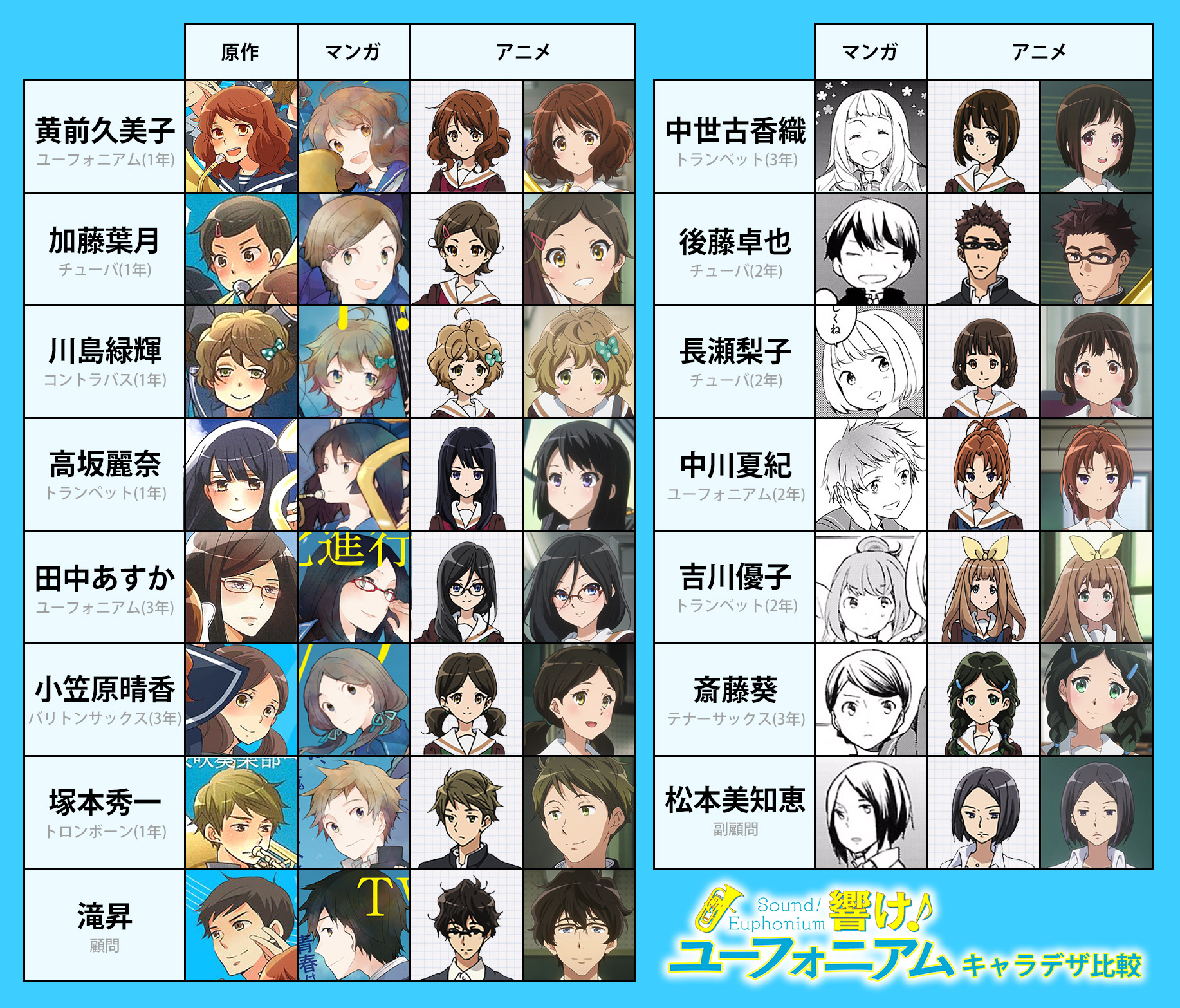 '울려라! 유포니엄'의 원작, 만화, 애니메이션 캐릭터 그림체 비교 그림