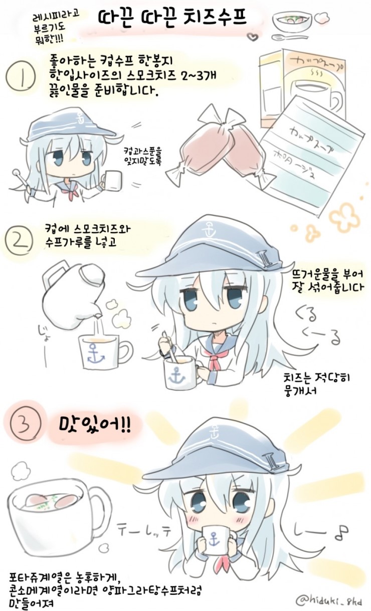 린스갓 [칸코레]칸코레 간단 레시피 - 따끈 따끈 치즈수프 작성일시 : 2016. 05. 30 (07:17) 조회 : 2,160 / 댓글 : 0 히비키다 히비키!! 출처(링크) : http://blog.naver.com/animalking/220719169835 2추천 글쓰기스크랩 신고