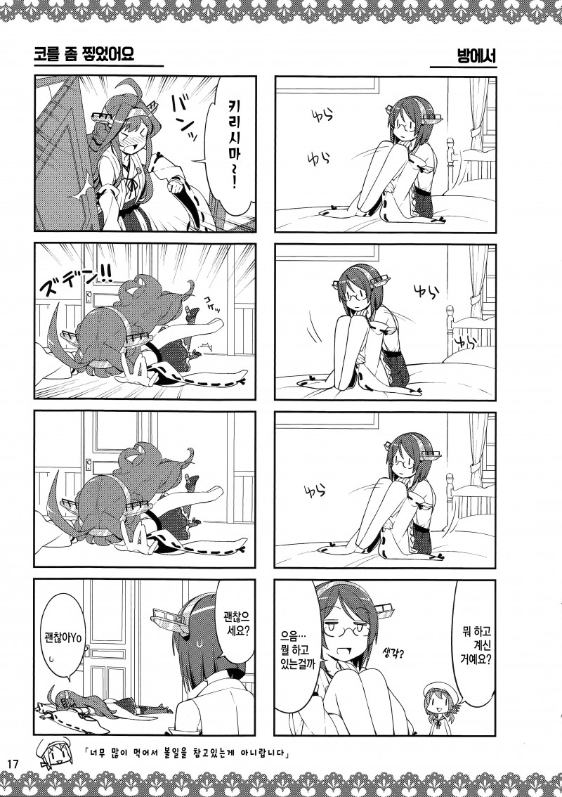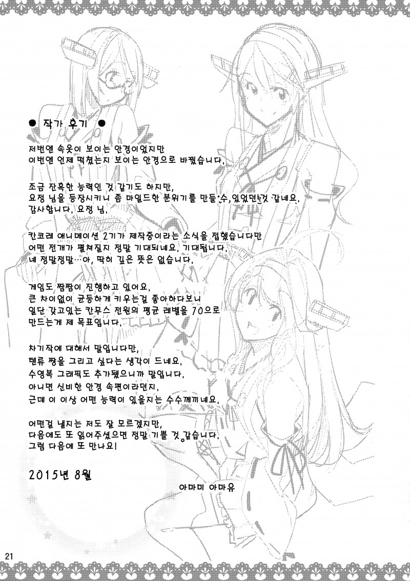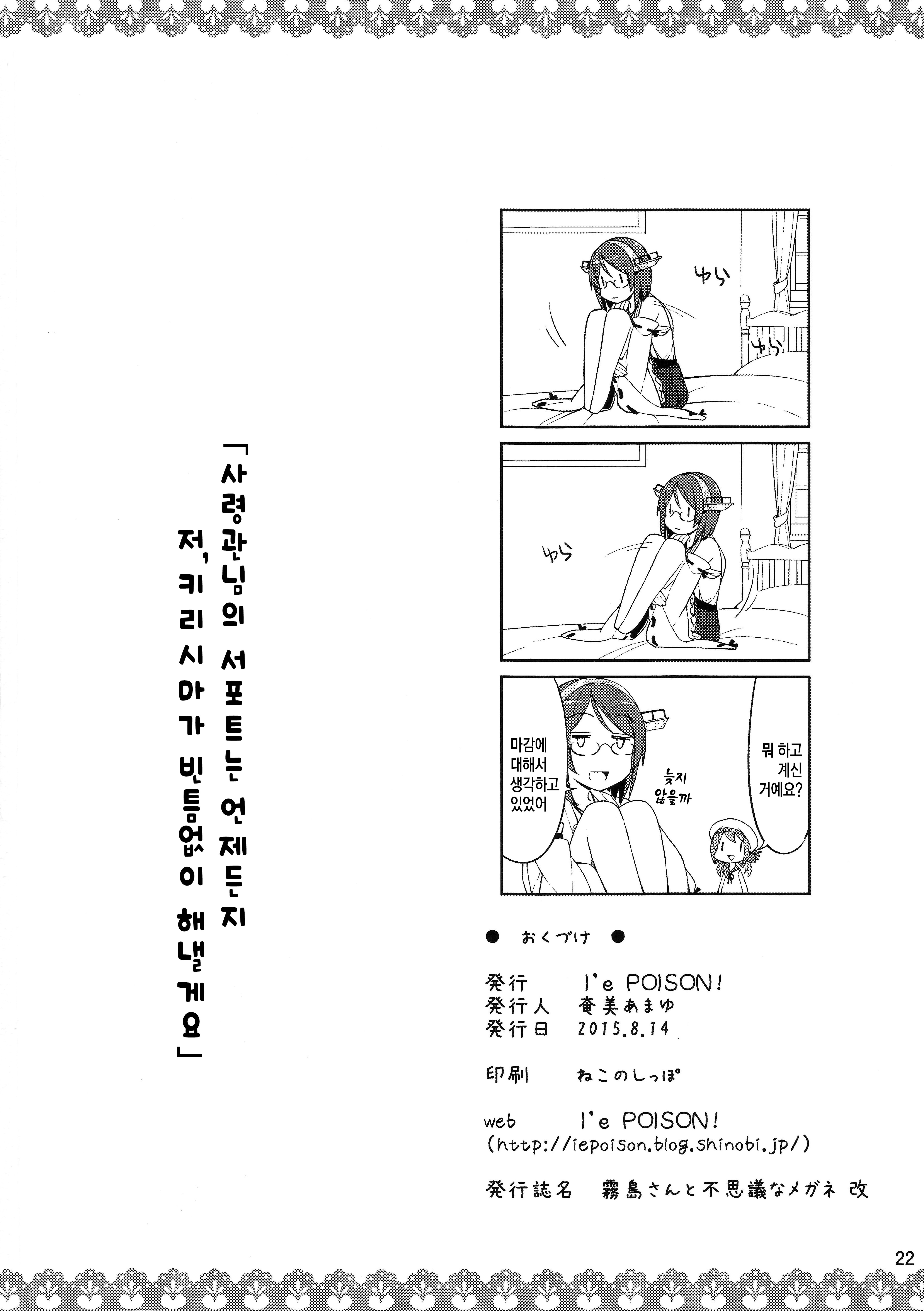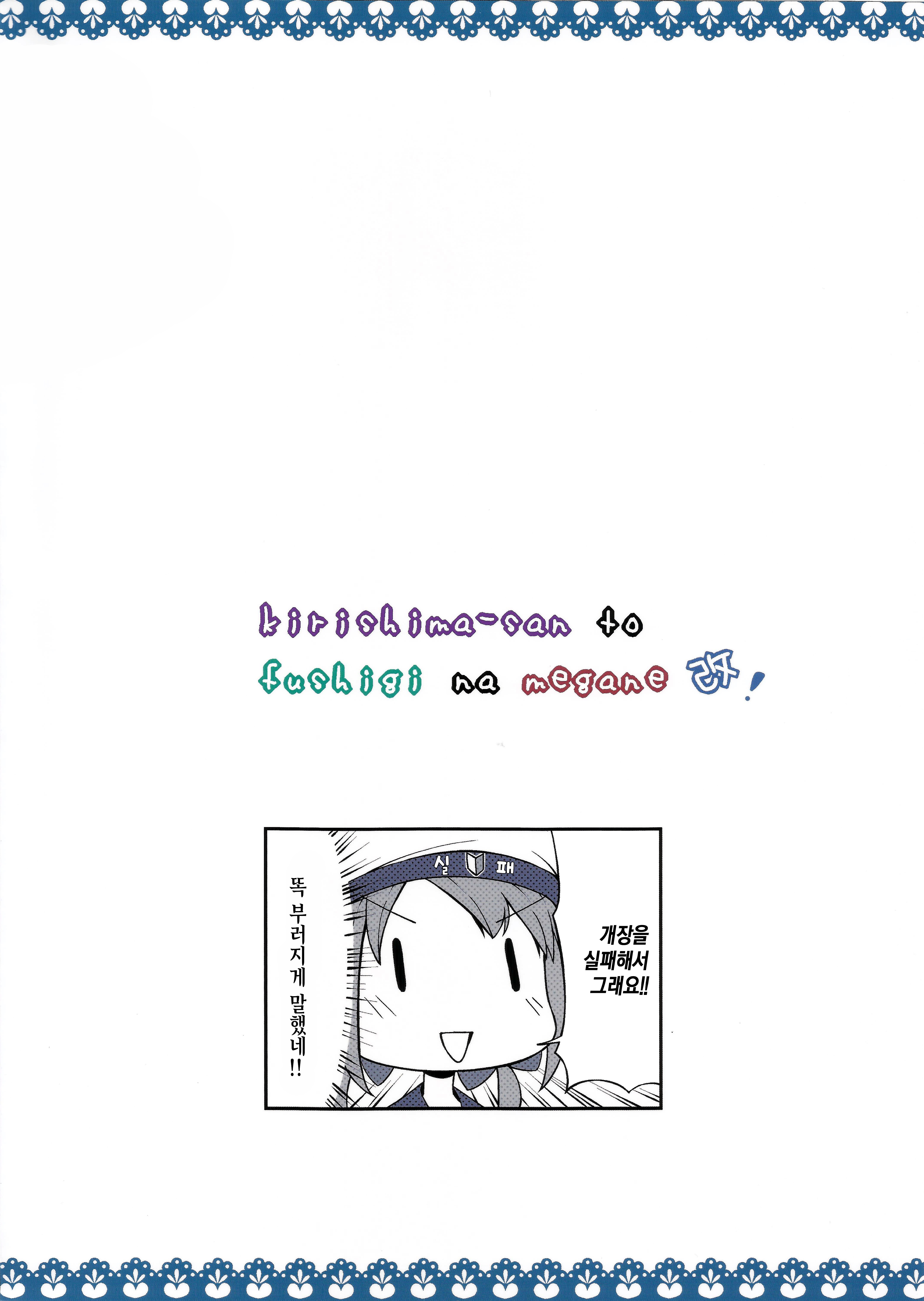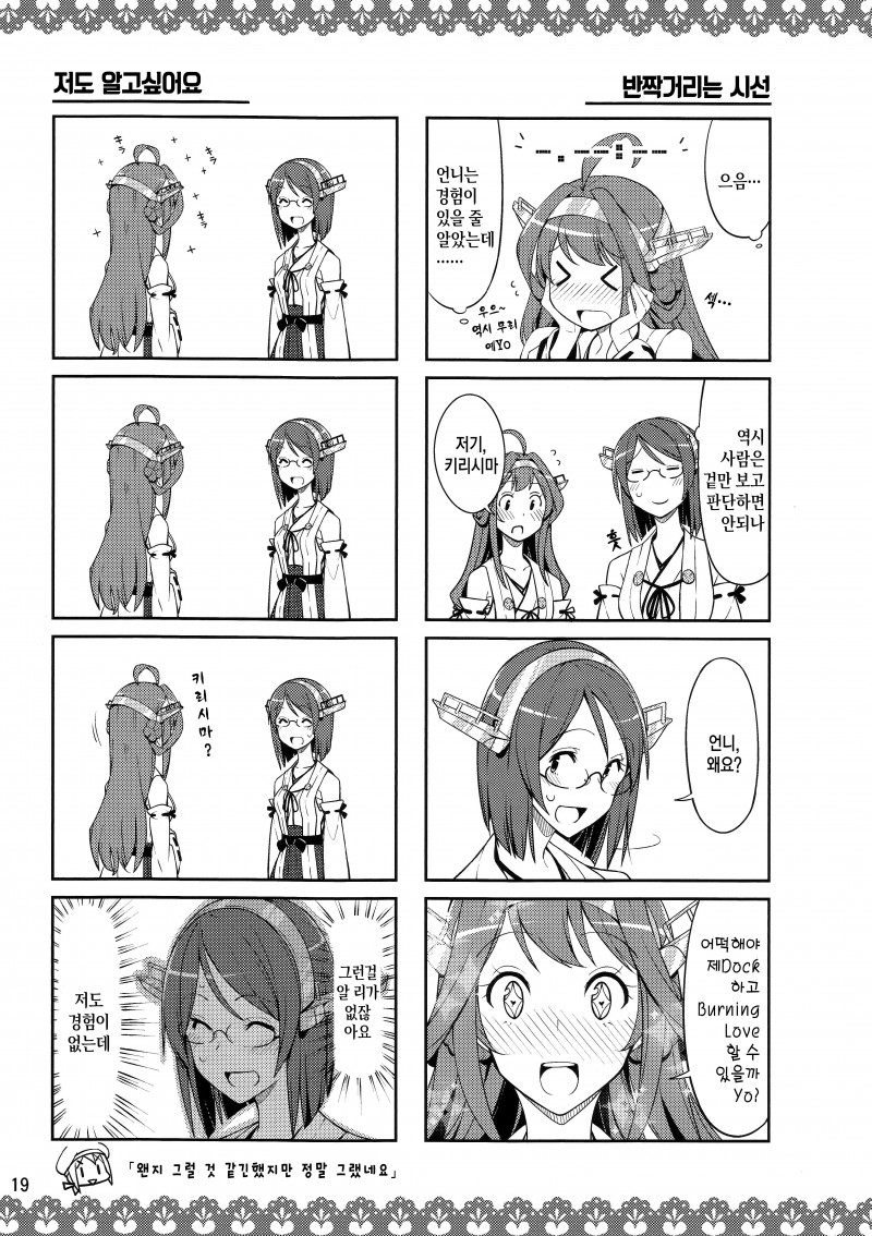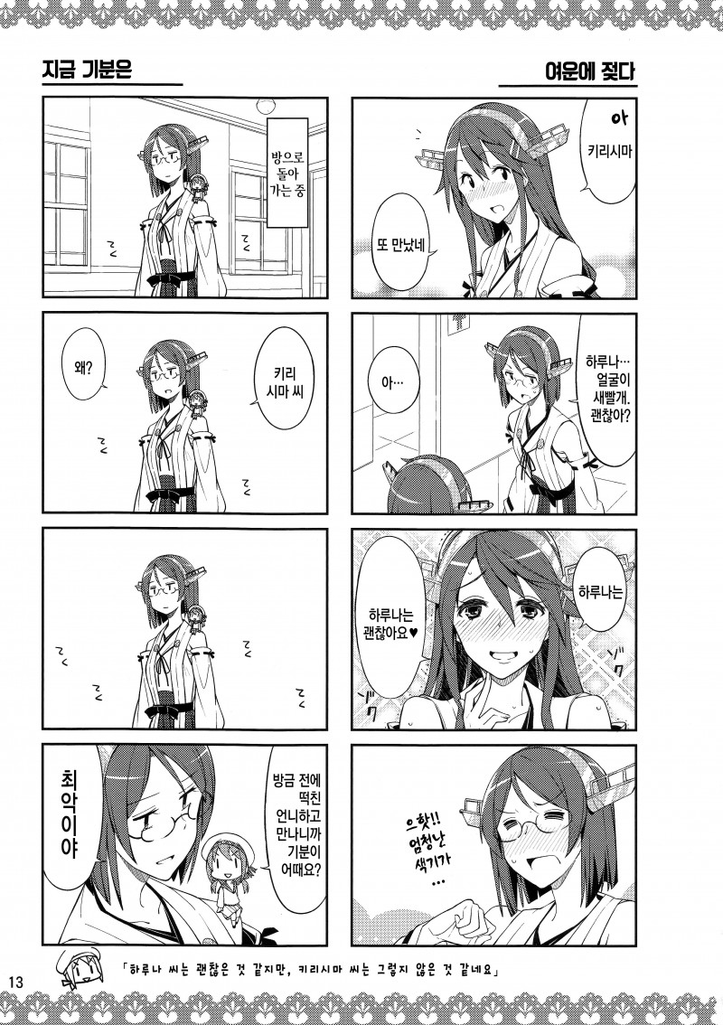 MoonIRIs 함대 콜렉션 - 키리시마씨와 신비한 안경 改 작성일시 : 2015. 09. 09 (15:17) 조회 : 18,948 / 댓글 : 2 어제 올린 동인지의 후속편입니다!!! 이번 동인지는 섹X 한 이후의 시간이 보이는 안경을 쓴 키리시마의 이야기!! 아앜ㅋㅋㅋㅋㅋ 분명히 소재는 야한건데 전혀 야하지가 않앜ㅋㅋ 앞에 편과는 다르게 이제는 개그밖에 남지 않았어!! 이런 동인지 정말 좋습니다!!! 그리고 과연 키리시마의 심정은 어떨까요!! 방금 전에 X스를 한 언니와 만난 기분!! 진짜 저런 안경 갖고 싶다!! 3추천 글쓰기스크랩 신고
