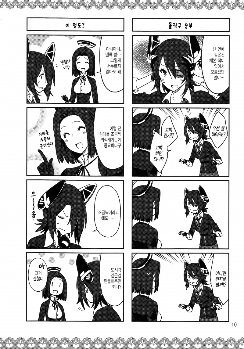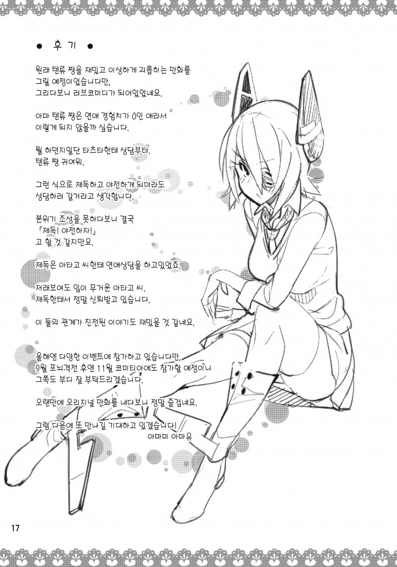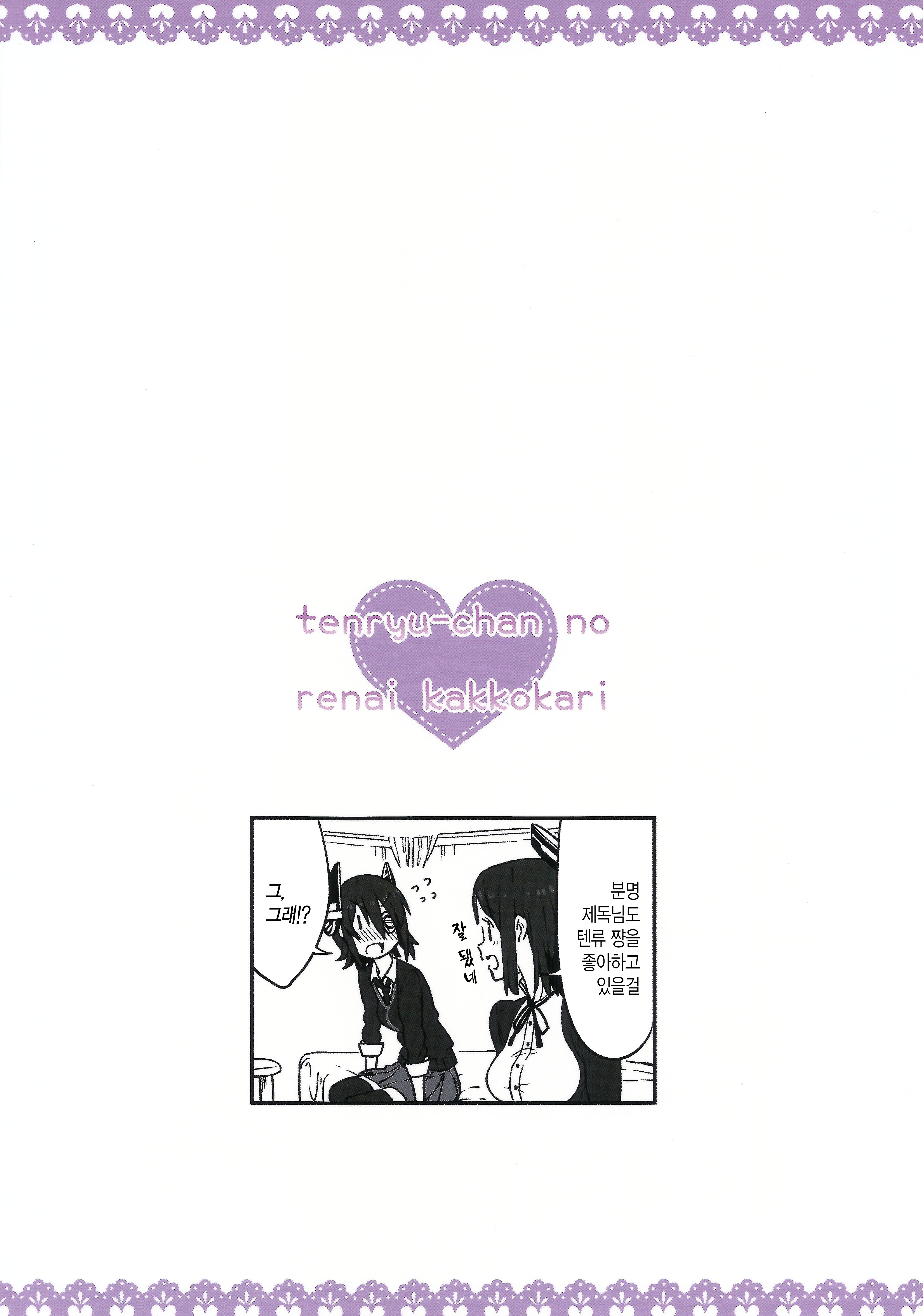 MoonIRIs 함대 콜렉션 - 텐류쨩의 연애 괄호열고 가 괄호닫고 작성일시 : 2015. 11. 21 (21:09) 조회 : 12,783 / 댓글 : 1 전에 올렸던 키리시마씨와 신비한 안경 시리즈의 작가분이 그리신 작품입니다!! 이번엔 텐류가 귀여운 동인지이군요!!! 뭐랄까 둘이 풋풋한게 참 좋군요?ㅋㅋㅋㅋㅋㅋ 3추천 글쓰기스크랩 신고