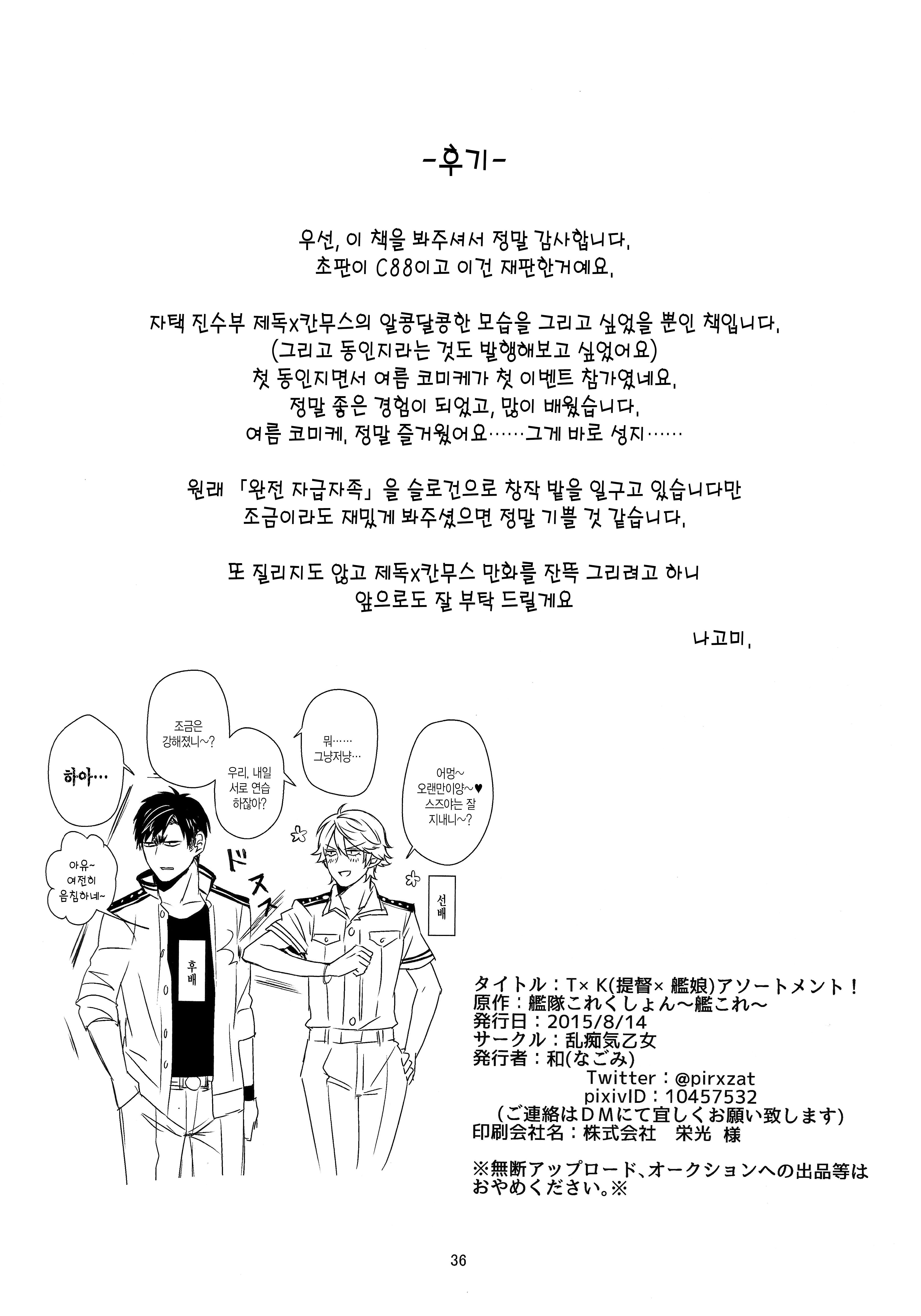 MoonIRIs 함대 콜렉션 - TxK(제독 x 칸무스) 어소트 먼트! 작성일시 : 2015. 12. 24 (14:40) 조회 : 14,242 / 댓글 : 1 하악! 이 작가분꺼는 언제봐도 재미있습니다!! 오카마 제독이라던가 메가데레인 스즈야라던가!!! 2추천 글쓰기스크랩 신고