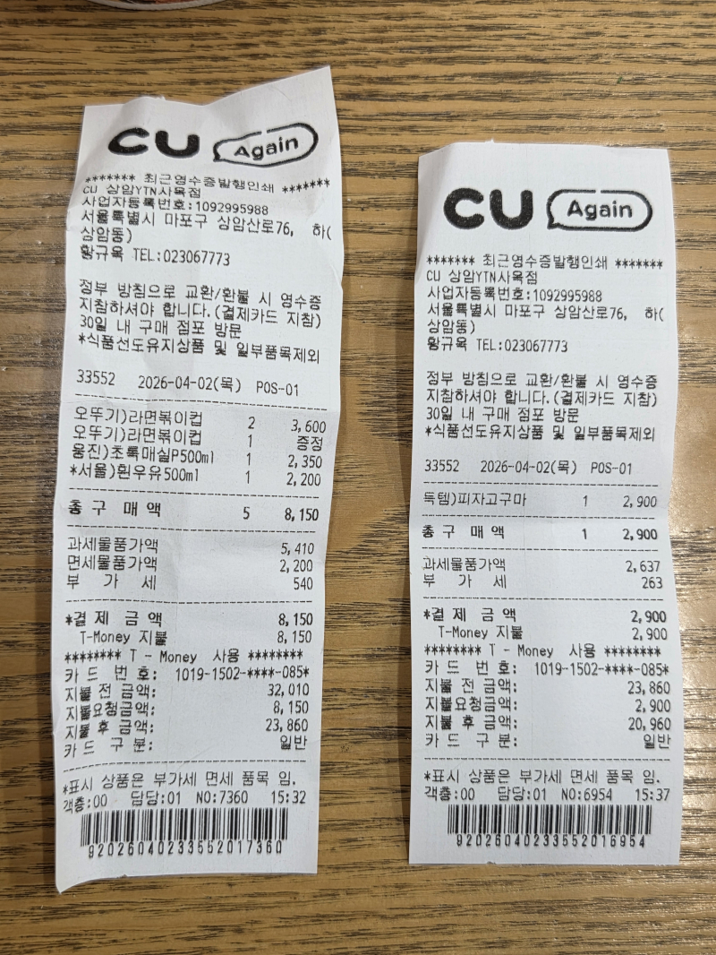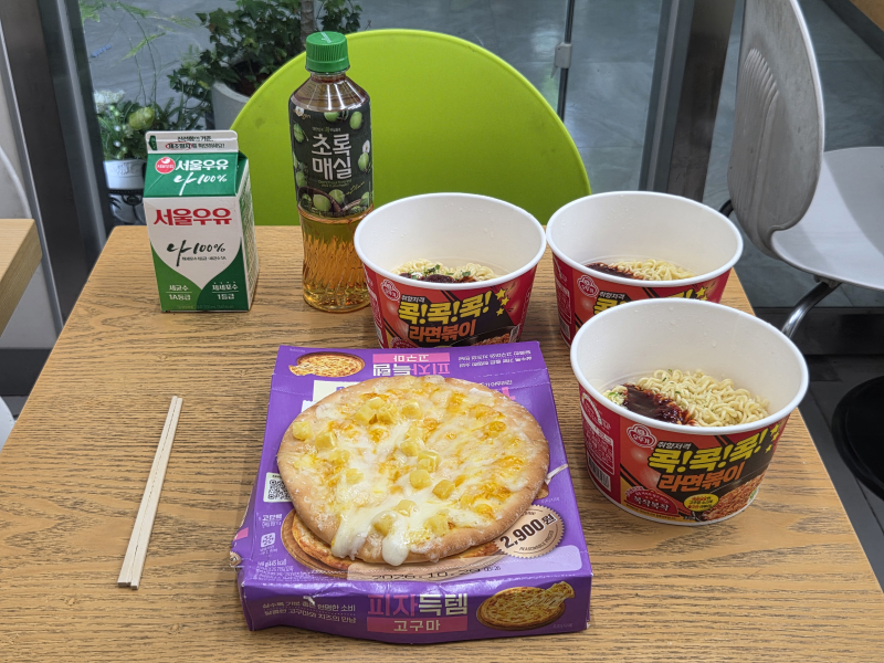 라면볶이 3개, 고구마피자, 서울우유 500ml, 초록매실까지 사고~ 맛있게 먹었다오~
