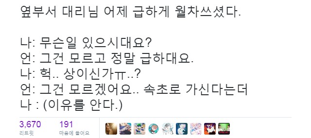 린스갓 어제 급하게 월차 쓰신 옆부서 대리님 [일반] 작성일시 : 2016. 07. 18 (15:06) 조회 : 1,127 / 댓글 : 0 속초마을에 가셨군요 0추천 글쓰기스크랩 신고