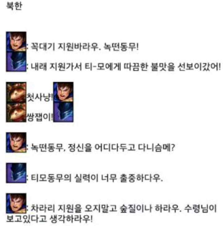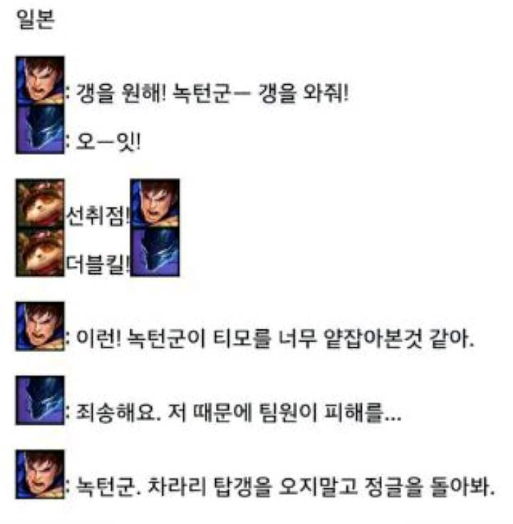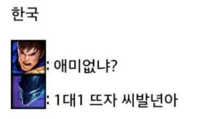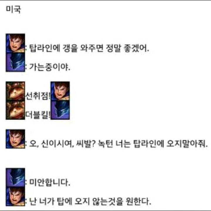 ㅋㅋㅋ한국 참고로 미국도 만만치않아요 젠장할. 가렌: 탑 ㄱㄱ 녹턴: ㅇㅇ 퍼스트 블러드 더블 킬 상황 1 탑오지마 상황 2 가렌:[삠 삐리리리빕] 개허접 시리 나무랭크냐? 녹턴:[삐미리리미림] 넌 지롤 하냉 상황 3 GG