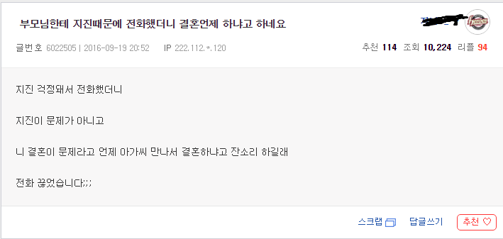 지진 때문에 부모님 걱정되서 전화드린 효자